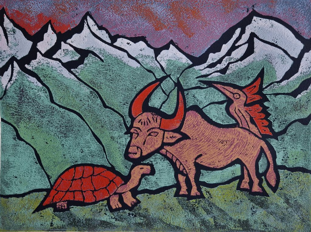 Three Friends. A bird sitting on the back of a water buffalo and enjoying the view. A turtle walks beside them. The three friends seem to be on their way and are excited about what they are about to experience. The woodcut is in a simple but colourful style. The lines are clear and the colours are warm and inviting. The scene is peaceful and idyllic, and it conveys a sense of hope and adventure. „Three Friends“ is a woodcut that celebrates the power of friendship and the beauty of nature. It is an inspiring image that reminds us that together we can achieve much.
